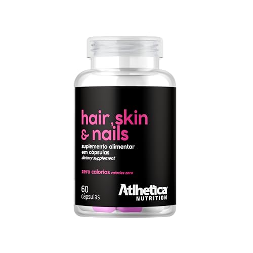 O hair, skin & nails da atlhetica nutrition é uma combinação de vitaminas, minerais e metionina livre de glúten zero calorias